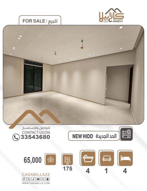 للبيع شقة تملك حر لجميع الجنسيات في منطقة الحد الجديدة قريبة من جميع الخدمات، أولا تفاصيل الشقة 1 مجلس خاص بالرجال مع حمام 1 صالة عائلية مع بلكونه 3 غرف نوم منها غرفتين ماستر 4 حمامات 1 مطبخ 2 بلكونات ثانيا المرافق والخدمات موقف سيارة مظلل يوجد صرف صحي مصعدين نوعية اوتس قرب الخدمات والمرافق العامة قرب المسجد كمرات المساحة 175 متر السعر 65000 ألف دينار للتواصل