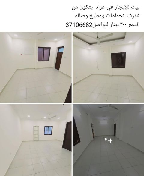 بيت للإيجار في عراد يتكون من 5 غرف، 4 حمامات، ومطبخ، وصالة. السعر 300 دينار. للتواصل
