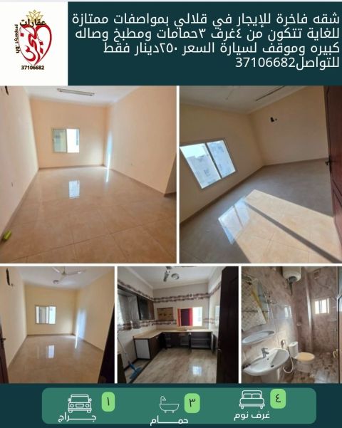 شقة فاخرة للإيجار في قلالي بمواصفات ممتازة للغاية، تتكون من 4 غرف، 3 حمامات، مطبخ، صالة كبيرة، وموقف للسيارة. السعر 250 دينار فقط. للتواصل