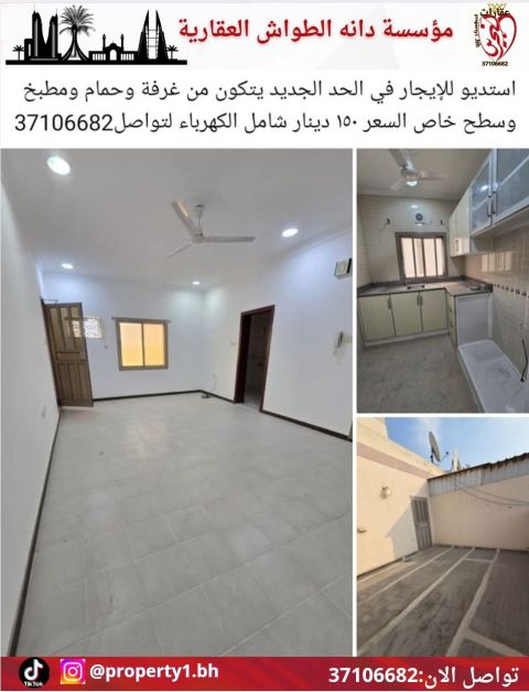 A studio for rent in Al-Hadd Al-Jadeed, consisting of a room, bathroom, kitchen, and private roof. The price is 150 dinars, including electricity. For contact.