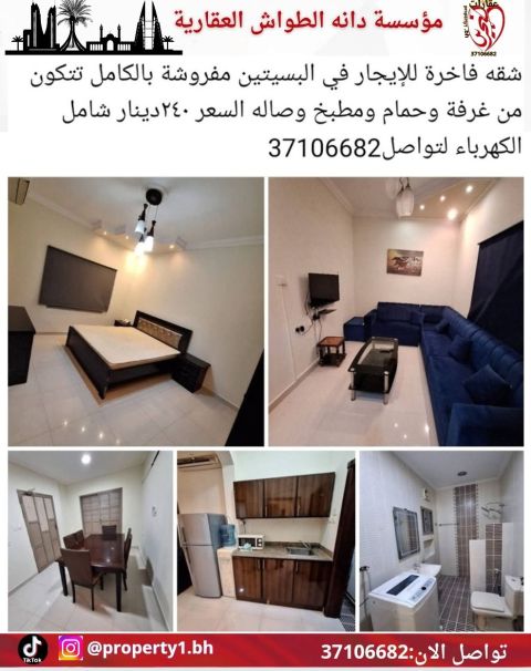 For rent: A fully furnished apartment in Bseiteen, near King Hamad Hospital. It includes a living room, 3 bedrooms, 4 bathrooms, and a kitchen. The price is 480 dinars, negotiable, and includes electricity for 30 dinars. For contact.