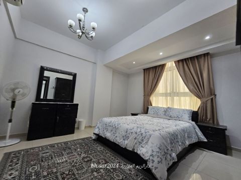 In Hidd city, a luxurious semi furnished apartment for rent, first occupant, with a stunning sea view. It consists of 2 master bedrooms, 3 bathrooms, a spacious living room, a kitchen, a balcony, and parking. Services include a gym, prayer room, children'play area, jacuzzi, sauna, cafe, and swimming pool. The price is 430 dinars, including electricity. For contact, call