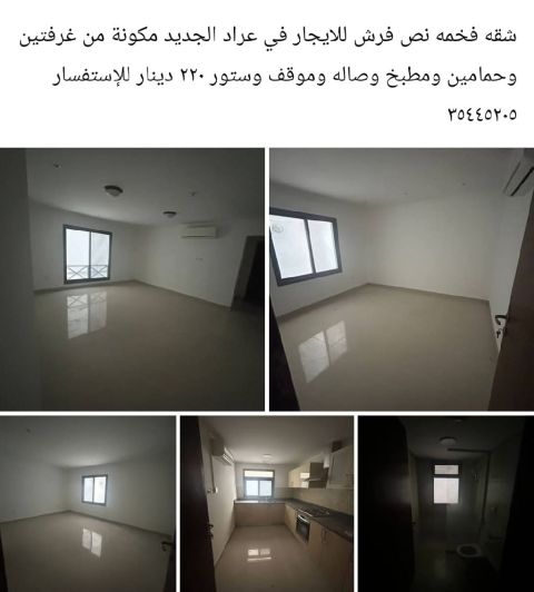 For rent, a furnished apartment in Al-Hadd consisting of two rooms, two bathrooms, a hall, a kitchen, and a balcony for 210 dinars, including electricity and water up to a maximum of 20 dinars.