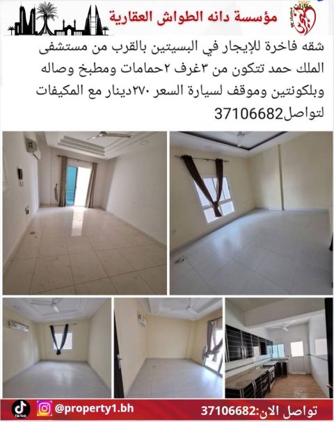 For rent: A fully furnished apartment in Bseiteen, near King Hamad Hospital. It features a living room, 3 bedrooms, 4 bathrooms, and a kitchen. The price is 480 dinars, negotiable, including electricity for 30 dinars. For contact.