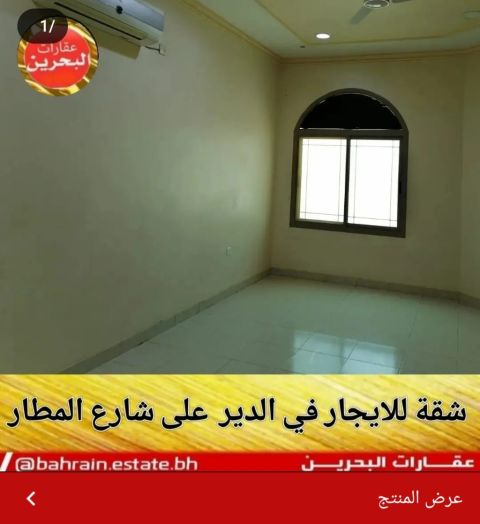 An apartment for rent in Ad-Dair on Airport Road, close to the sea leading to Diyar Al Muharraq and Al-Danin, in excellent condition, excellent location, first row, furnished, and equipped with split air conditioners.