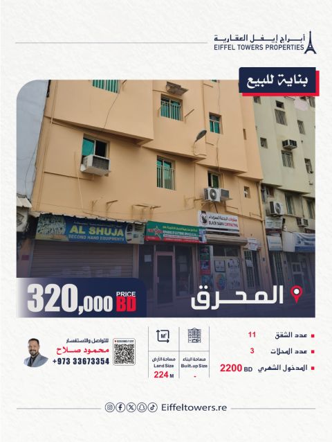 شركة أبراج أيفل العقارية تعرض للبيع بناية سكنية تجارية في موقع مميز في المحرق. البناية مكونة من 11 شقة (كل شقة تحتوي على غرفتين، صالة، مطبخ، وحمامين). 8 شقق مزودة بعداد كهرباء مستقل. 3 شقق مع 4 استوديوهات تعمل على كهرباء مدخل البناية. يوجد 3 محلات تجارية في مدخل البناية. هناك مكان مخصص لتركيب مصعد (لفت). المدخول الشهري سابقاً كان حوالي 2700 دينار بحريني، وحالياً حوالي 2200 دينار بحريني. سعر البيع 320,000 دينار بحريني (قابل للتفاوض).