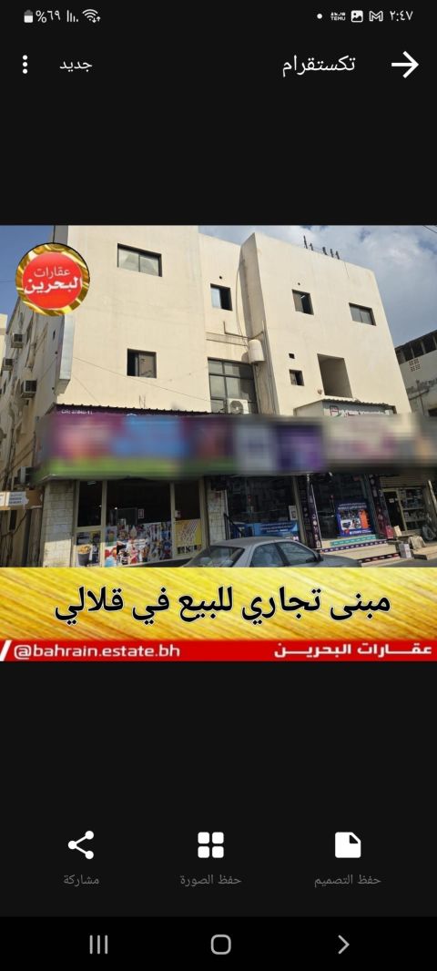 للبيع: بناية تجارية في قلالي تحتوي على 4 محلات تجارية و7 شقق. كل شقة بها 3 غرف نوم، حمامين، مطبخ، وصالة. المساحة الإجمالية 450 متر مربع. السعر 340,000 دينار بحريني قابل للتفاوض.