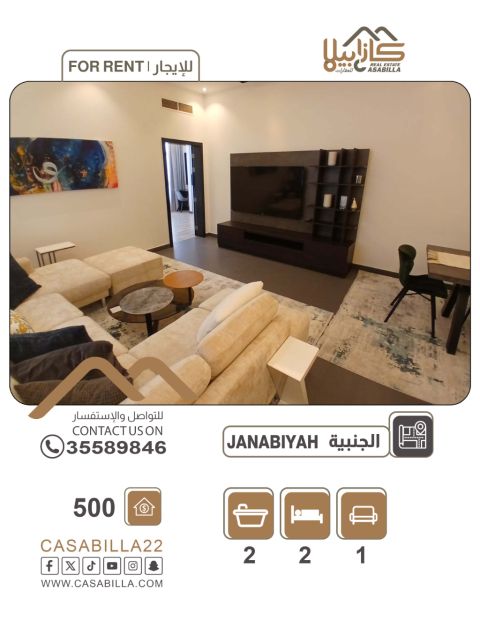 An apartment for rent in the Janabiya area, consisting of two bedrooms, a living room, a kitchen, and two bathrooms. The apartment is fully furnished with all furniture available and ready for occupancy. The rent includes electricity, water, and internet. The electricity meter is 30 Bahraini dinars. The rental price is 500 Bahraini dinars. Additional features include an elevator, parking, and a prime location in Janabiya. For contact and inquiries.