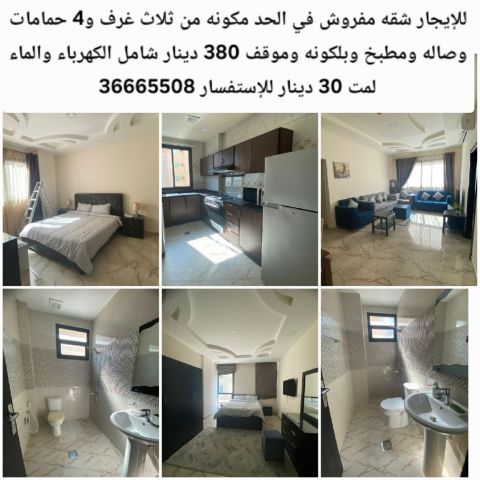 للإيجار شقة مفروشة في الحد تتكون من ثلاث غرف وأربعة حمامات وصالة ومطبخ وبلكونه وموقف سيارات بسعر 380 ديناراً، تشمل الكهرباء والماء، مع رسوم قدرها 30 ديناراً.