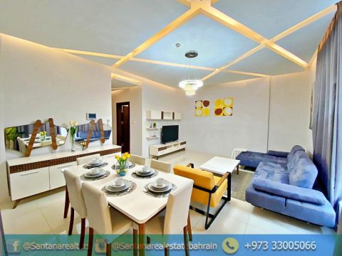 شقة مذهلة مفروشة للإيجار في منطقة الحد، تحتوي على غرفة نوم واحدة، حمامين، صالة، مطبخ مفتوح، بلكونه، مسبح، وصالة ألعاب رياضية. السعر 330 دينار بحريني ويشمل الكهرباء