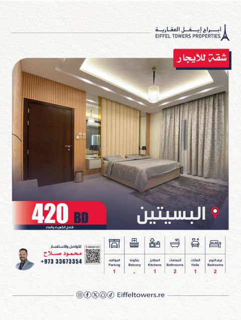 شركة أبراج أيفل العقارية تقدم شقة للإيجار في البسيتين. تتميز بصالة كبيرة، وغرفتي نوم، ومطبخ، وحمامين، وموقف سيارات، ومصعد. قيمة الإيجار 420 دينار بحريني شامل للكهرباء والماء. للتواصل، اتصل بمحمود صلاح عبر eiffeltowers.re. الشركة وسيط معتمد من قبل مؤسسة التنظيم العقاري برقم الترخيص B202403/1257.