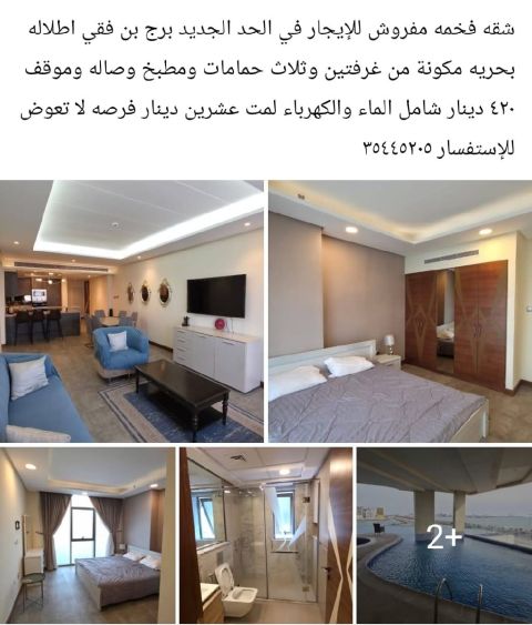 Harbor Real Estate offers a fully furnished apartment for rent in the Jazeera Al Reef area with a sea view. It consists of 3 bedrooms, 4 bathrooms, a living room, a fully equipped kitchen, a laundry room, a dining area, a balcony, and a maid's room. It also includes a swimming pool, gym, shaded parking for two cars, 24-hour security, and reception. The required monthly rent is 1,200 Bahraini dinars, including electricity and water.