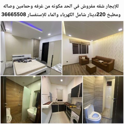 For rent: A luxurious furnished apartment in Al Hadd Al Jadeedah with a master bedroom, two balconies, sea view, two bathrooms, living room, kitchen, building services, health club, children's playroom, swimming pool, private parking, internet services. 290 dinars including electricity, without furniture.