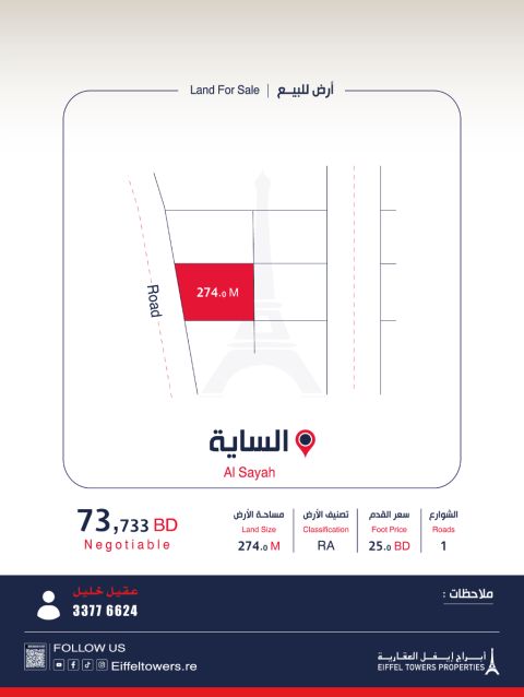 شركة أبراج أيفل العقارية تعرض للبيع أرضاً في الساية بمساحة 274 متراً مربعاً، مصنفة كسكن خاص (أ RA). سعر القدم المربع 25 ديناراً بحرينياً، والسعر الإجمالي 73,733 ديناراً بحرينياً. للتواصل: عقيل خليل، eiffeltowers-re، eiffeltowers.re، وسيط معتمد من قبل مؤسسة التنظيم العقاري برقم الترخيص B202403/1257.