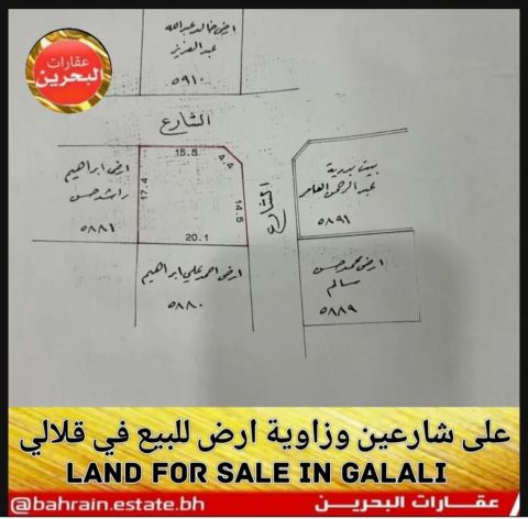 Land for sale in Qalali on two streets and a corner. The land area is 331 square meters. The price is 95,000 Bahraini dinars, negotiable. For contact.