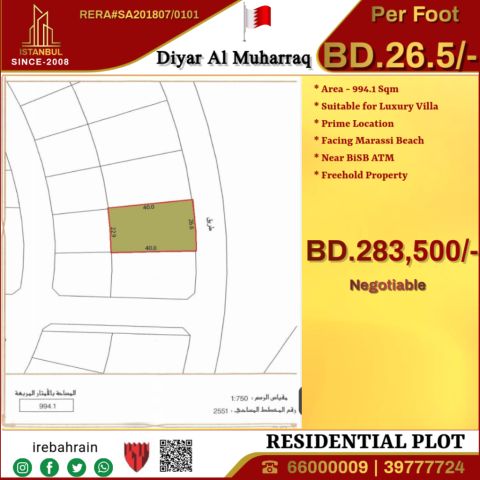 Exclusive residential land for sale in Diyar Al-Muharraq - 26.5 Bahraini dinars per square foot. Are you looking for the perfect land to build your dream luxury villa This premium residential land in Diyar Al-Muharraq offers the following a prime location - facing Marassi Beach with stunning views, a large land area of 994.1 SQM - ideal for an elegant villa, competitive price of 26.5