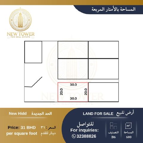 For sale, land B6 in Al-Hadd Al-Jadeedah, area 600 meters, price per foot 31 dinars, total price 200,000 dinars. For contact: Al-Burj Al-Jadeed Real Estate.
