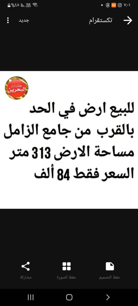 Land for sale in Al-Hadd, near Al-Zamil Mosque, with an area of 313 square meters, price only 84,000 Bahraini dinars.