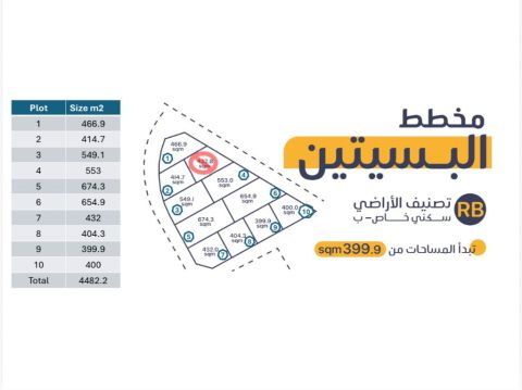 A distinguished investment and residential opportunity in Al Bosaiteen: A land plot plan in Al Bosaiteen - classified as private residential (RB). Are you looking for your land to build your dream home or to invest in a strategic and in-demand location? Do not miss this opportunity. Features of the plan: Location: Al Bosaiteen - one of the most upscale residential areas. Classification: Private residential (RB) allows for building villas or private residential buildings. Areas start from 399.9 square meters (approximately 4304.5 square feet). The plan includes 10 land plots with different areas.