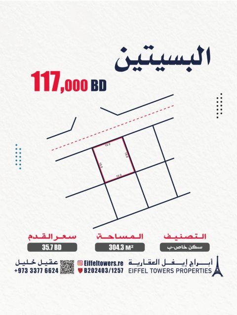 Eiffel Towers Real Estate Company offers for sale a land in Al-Basateen with an area of 304.3 square meters. Classification: Private Residential (RB). Price per square foot: 35.7 Bahraini dinars. Total price: 117,000 Bahraini dinars. For contact: Aqeel Khalil. Eiffel Towers Real Estate is an intermediary certified by the Real Estate Regulatory Authority, license number B202403/1257.