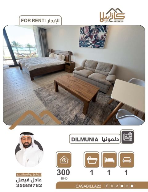 For rent: A studio in Al-Hadd, in an upscale building. Studio details: one room, bathroom, and kitchen. Area: 44.5 square meters. Building amenities and services include: swimming pool, jacuzzi, men's gym, women's gym, cinema, game room, aerobics room, children's playroom, sauna, steam room, prayer room. Rental price: 250 dinars, including 30 dinars for utilities. For contact.
