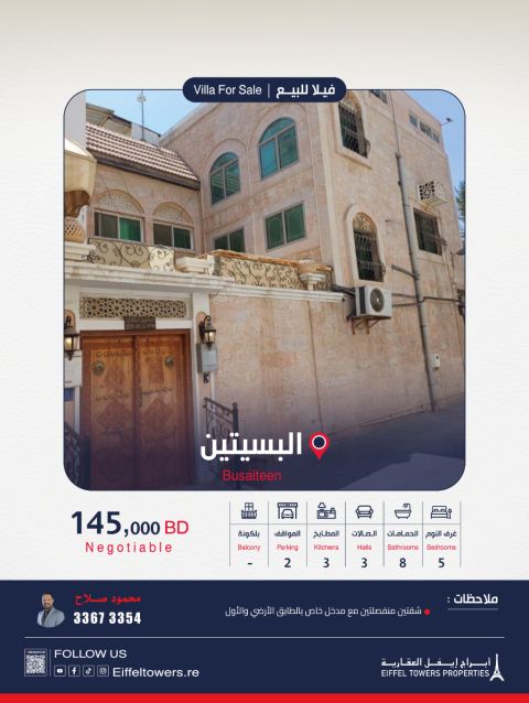 فيلا جديدة للبيع في البسيتين، 5 غرف نوم، 5 حمامات، صالة، مطبخ، غرفة خادمة، موقف سيارات لسيارتين، 125,000 دينار بحريني.