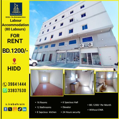 A new labor accommodation for 80 individuals is available for rent in Hidd for 1200 Bahraini Dinars. This accommodation is located in Hidd city near Dilmunia and contains 16 rooms, 12 bathrooms, 6 spacious halls, 6 kitchens, an elevator, and more. It can accommodate 80 workers. car parking is available behind the building. It is near the Highway, restaurants, a refrigerator, and a salon. We offer