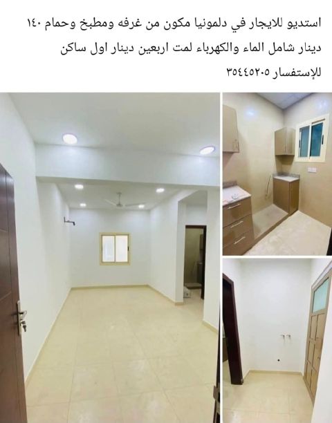 استوديو للإيجار في دلمونيا يتكون من غرفة ومطبخ وحمام بمبلغ 140 دينار شامل الماء والكهرباء