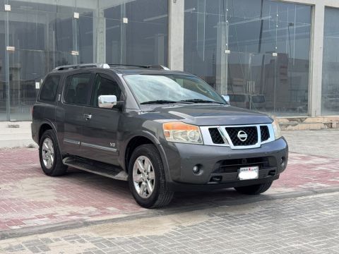 Nissan Armada LE 2012 (Grey). Mileage: 218,500 km. Full options include alloy wheels, sensors, Bluetooth, cruise control, camera, sunroof, leather seats, new tires, new battery, and more. 8 cylinders, 5.6L engine, 8 seats. Price: BD 3,500 (negotiable). Insurance valid until August 2026 (full coverage). Contact for details.