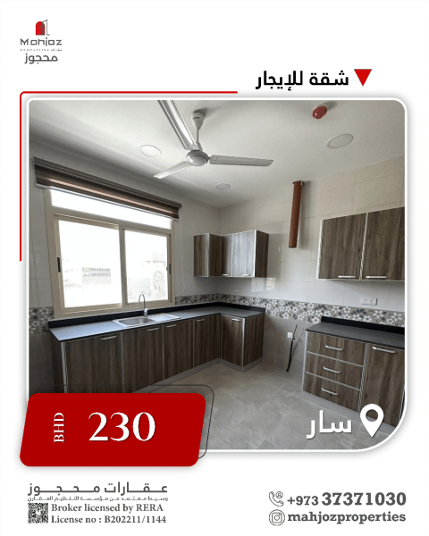 شقة للإيجار في سار. الموقع: سار. 3 غرف نوم، 3 حمامات، صالة واسعة، مطبخ، مصعد، كاميرات أمنية، موقف سيارة. الإيجار 230 دينار بحريني شهرياً. تواصل معنا لمزيد من التفاصيل على 00973 - عقارات.