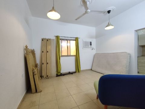 Studio flat for rent in Diraz, beside Al Helli Market, on the main road. It includes partial furniture and air conditioning. The rent is BD140 per month with unlimited EWA. It has one room, a kitchen, and a bathroom. An elevator and car parking are available. Reference number K181004. Contact for more details