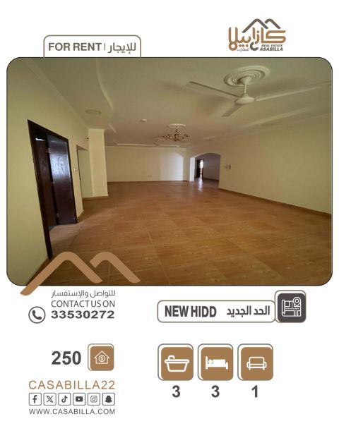 For rent: An apartment in Al-Hadd Al-Jadeed, suitable for families and close to all services. Apartment specifications: 3 bedrooms, 3 bathrooms, a large living room, a large kitchen, an elevator, and a parking space. Price: 250 Bahraini dinars, excluding electricity. Price is negotiable. For contact and inquiries.