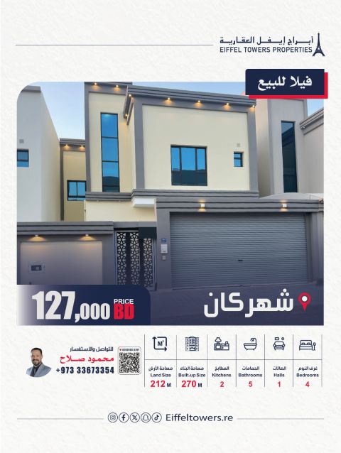 Eiffel Towers Real Estate Company offers a villa for sale in Shahrakan. The land area is 212 sqm and the built-up area is 270 sqm. Villa details: 4 bedrooms, 1 living room, 2 kitchens, 5 bathrooms, and 2 parking spaces. Additional features include a laundry area. The total price is 127,000 Bahraini dinars. For contact: Mahmoud Salah, eiffeltowers.re, eiffeltowers.re. Certified broker by the Real Estate Regulatory Authority, license number B202403/1257.