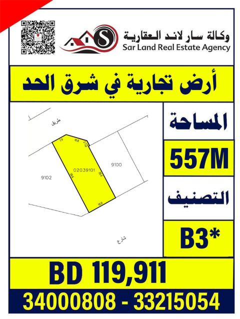 أرض تجارية في شرق الحد، موقع ممتاز، بنية تحتية متكاملة، مساحة 557 متر مربع، تصنيف B3، السعر 119911 ألف دينار، وكالة سار لاند العقارية