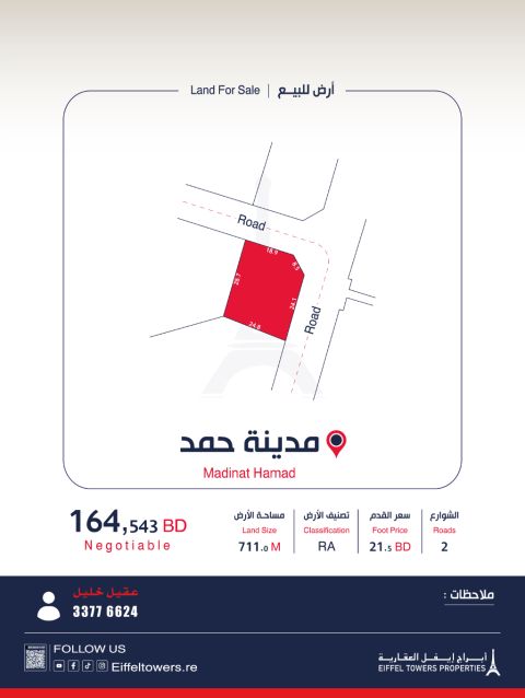 شركة أبراج أيفل العقارية تعرض للبيع أرضاً في مدينة حمد. المساحة 711 متر مربع. التصنيف سكن خاص (أ RA). سعر القدم المربع 21.5 دينار بحريني. السعر الإجمالي 164,543 دينار بحريني. للتواصل: عقيل خليل، eiffeltowers-re، eiffeltowers.re. وسيط معتمد من قبل مؤسسة التنظيم العقاري، رقم الترخيص B202403/1257.
