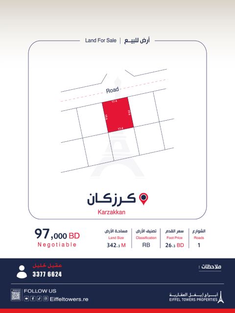 شركة أبراج أيفل العقارية تعرض للبيع أرضاً في كرزكان بمساحة 342.3 متر مربع، مصنفة كسكن خاص (RB). سعر القدم المربع هو 26.32 دينار بحريني، والسعر الإجمالي هو 97,000 دينار بحريني. للتواصل، عقيل خليل، eiffeltowers.re، eiffeltowers.re، وسيط مرخص ومعتمد من قبل مؤسسة التنظيم العقاري، رقم الترخيص B202403/1257.