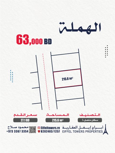Eiffel Towers Real Estate Company offers for sale a land in Al Hamla with an area of 215.6 square meters. Classification: Residential attached (A RHA). Price per square foot: 27.1 Bahraini dinars. Total price: 63,000 Bahraini dinars. For contact: Mahmoud Salah. Eiffel Towers Real Estate is an intermediary certified by the Real Estate Regulatory Authority, license number B202403/1257.