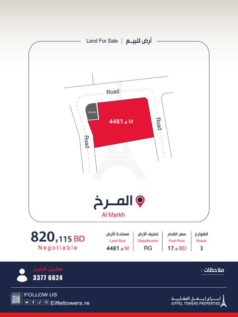 Eiffel Towers Real Estate Company offers for sale a land in Al-Markh with an area of 4481.8 square meters, classified as residential garden - RG, price per foot 17 BD, total price 820115 BD. For contact: Aqeel Khalil, eiffeltowers.re, a licensed broker by the Real Estate Regulatory Authority with license number B202403 / 1257.