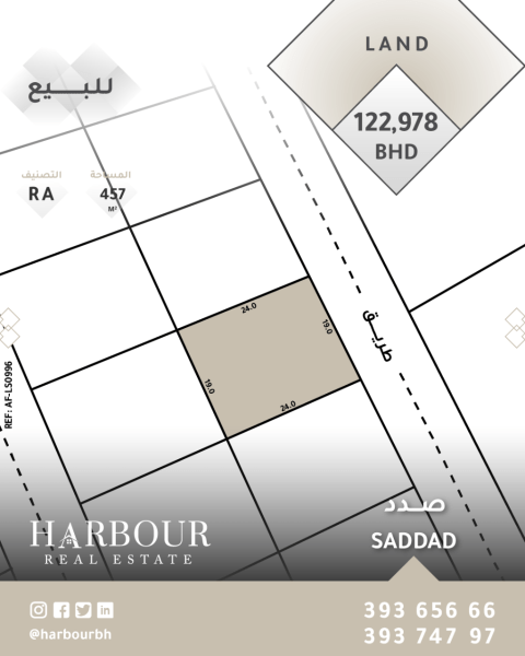 For sale, a land in Sdad, with an area of 457 SQM, classified as RA, with 1 street, priced at 122978 dinars. For inquiries, contact Abdullah Fadhl - LS0996