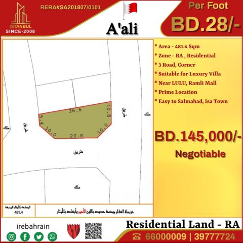 A corner residential land for sale in A'Ali, near Ramli Mall - 28 Bahraini Dinars per square foot. Prime location, ideal for developing a luxury villa. Unbeatable value. Take advantage of this exclusive land plot in the desirable A'Ali area, which enjoys an ideal location near Ramli and Lulu complexes. This land, with an area of 481.4 SQM, is classified as RA, making it a perfect site for