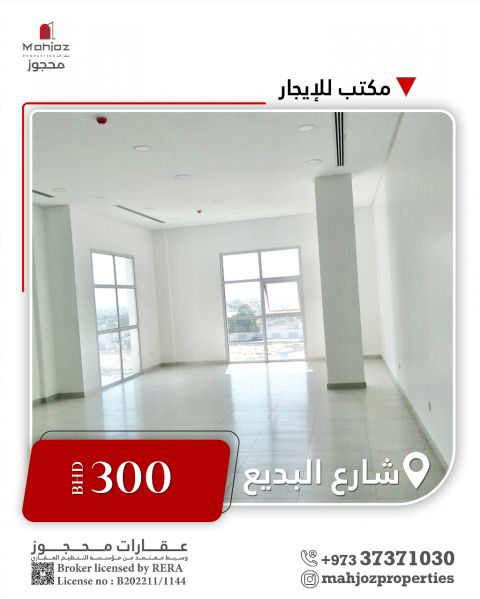 مكتب فاخر للإيجار - طريق البديع، 750 دينار بحريني. الموقع: طريق البديع، بالقرب من جنوسان. المساحة الإجمالية: 171 متر مربع. تكييف مركزي، دورات مياه، ومطبخ صغير. غرفة مكتب منفصلة، مخزن. الطابق الأول مع مصعد. موقف سيارات واسع يسمح باستخدام العنوان. مثالي لشركات التصميم الداخلي، المكاتب الإدارية، مراكز التجميل، وغيرها. الإيجار: 750 دينار بحريني شهرياً. سهولة الوصول إلى البديع، سار، بربر، جسر السعودية، والسيف.