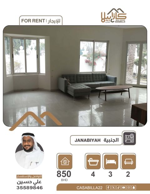 فيلا فاخرة ومفروشة بالكامل للإيجار في الجنبية. استمتع بنمط حياة يجمع بين الأناقة والهدوء في واحدة من أرقى المناطق السكنية في البحرين. تتميز هذه الفيلا بتصميم داخلي راق وأثاث مودرن تم اختياره بعناية لتوفير أقصى درجات الراحة والرفاهية للعائلات. تفاصيل الفيلا: الموقع: الجنبية - منطقة هادئة وراقية قريبة من كافة الخدمات الحيوية. الحالة: مفروشة بالكامل بأثاث فاخر وجاهزة للسكن. غرف النوم.