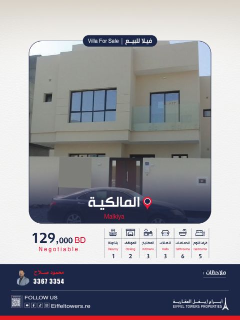 للبيع فيلا جديدة في المالكية، شارع المالكية، دوار 12. تتكون من كراج لسيارتين، ومجلس مفتوح على الصالة، ومطبخ خارجي، والدور الأول ثلاث غرف نوم ماستر مع حمامات. مساحة البناء 289 متر مربع. مساحة الأرض 186 متر مربع. السعر المطلوب 127000 دينار (قابل للتفاوض) الرمز B1195. وسيط عقاري معتمد، رقم الترخيص B202402 / 1247