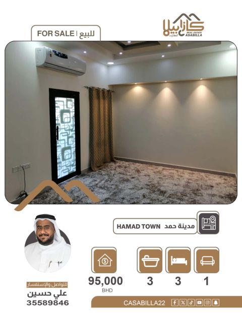 للبيع: منزل مجدد ونظيف جداً في مدينة حمد، الدوار 2، يسار، على 3 شوارع. مساحة الأرض 293 متر مربع ومساحة البناء 510 متر مربع. يتكون من مجلس منعزل مع حمام (مساحة المجلس 10*5)، وثلاث صالات مفتوحة متصلة ببعض، ومطبخين، وغرفة واحدة، وحمام مشترك للصالات. الدور الأول يحتوي على صالتين كبيرتين و5 غرف كبيرة مع حمام ماستر وحمام مشترك، بالإضافة إلى منور وبلكونة. المنزل مجهز بفلاتر تحلية. السعر: 147,000 دينار بحريني وقابل للتفاوض.