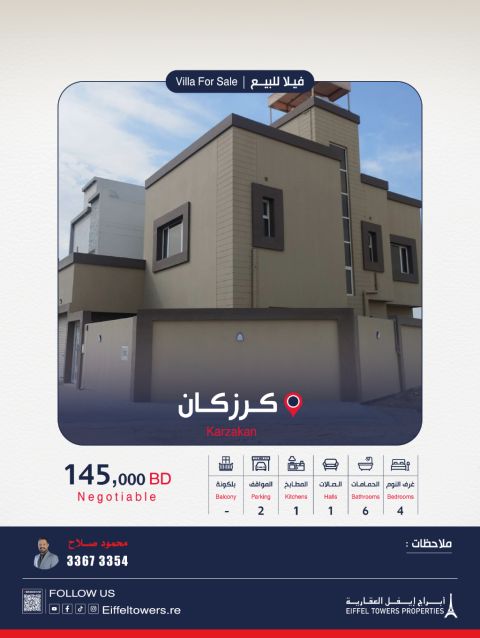 شركة أبراج أيفل العقارية تقدم فيلا جديدة للبيع في كرزكان. مساحة الأرض 218 متر مربع، ومساحة البناء 309 متر مربع. تفاصيل الفيلا تشمل: الطابق الأرضي: موقف لسيارتين، مطبخ كبير، مخزن، صالة كبيرة، حمام للضيوف، وغرفة مع حمام. الطابق الأول: غرفة ماستر مع حمام وغرفتين مع حمامات. الطابق الثاني: غرفة للعاملة المنزلية مع حمام. السعر المطلوب 145,000 دينار بحريني. للتواصل: محمود صلاح، eiffeltowers.re، وسيط معتمد من قبل مؤسسة التنظيم.