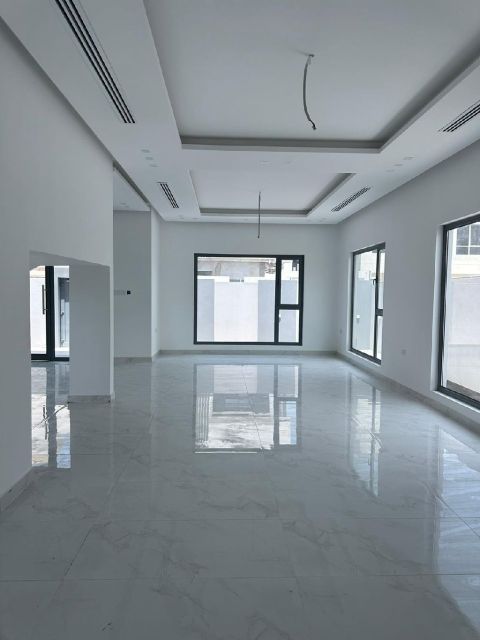 For sale, a villa in Hamad City, roundabout 9, right turn near the park. Area 535.5 square meters, consisting of one floor: a majlis, a large hall, a dining room, 3 bedrooms, a large kitchen, a small kitchen, a maid's room, a laundry room, 4 bathrooms, a front and side yard, a garage, with an external annex under construction that needs completion. The requested price is 140,000 dinars.