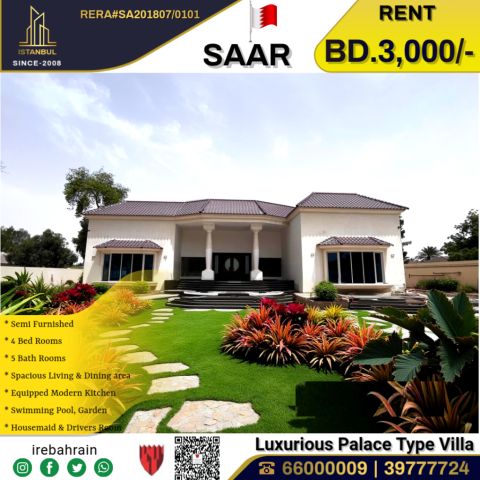 فيلا شبه مفروشة للإيجار في سار، بسعر 3000 دينار بحريني. تقع هذه الفيلا الجديدة كليا في منطقة سار الهادئة. تتكون من صالة معيشة واسعة، وغرفة طعام، وغرفة تلفزيون، و4 غرف نوم رئيسية مع خزائن ملابس واسعة، وسقف فاخر، واضاءة طبيعية في جميع أنحاء الفيلا، ومسبح جميل وواسع، ومطبخ حديث مجهز بالكامل، وغرفة خادمة، وغرفة سائق، ومخزن، ومنطقة غسيل، وصالة رياضية مع مخزن منفصل وحمام. كراج يتسع لسيارتين، ويمكن توفير