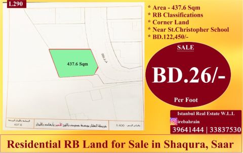 أرض سكنية زاوية (RB) للبيع في سار، بسعر 26 دينار بحريني للقدم. يقع هذا العقار الحصري في سار، بالقرب من مدرسة سانت كريستوفر البريطانية، مصنفة ك RB، ويمكن بناء مبنى سكني من 3 طوابق، بمساحة أرض 437.6 متر مربع، وهي زاوية. نقدم 26 دينار بحريني للقدم، ليصبح المجموع 122450 دينار بحريني. سهولة الوصول الى سار مول، طريق البديع السريع، جسر المملكة العربية السعودية، الجنبية، وغيرها