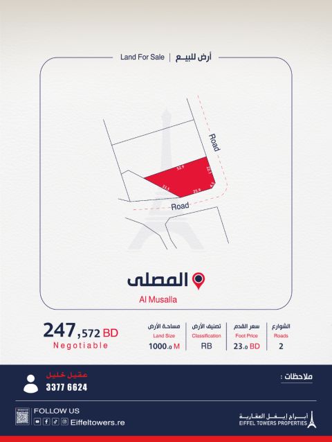 Eiffel Towers Real Estate Company offers a villa for sale in Sar. Land area: 330 sqm. Building area: 451 sqm. Villa details: 3 floors, 5 rooms, 2 halls, 1 kitchen, 2 garages, 6 bathrooms. Additional features: maid's room, laundry room, majlis, swimming pool, storage, central air conditioning, close to all services. Total price: 265,000 BHD. Contact: Ali Muhammad. eiffeltowers.re is a certified broker by the Regulatory Authority.