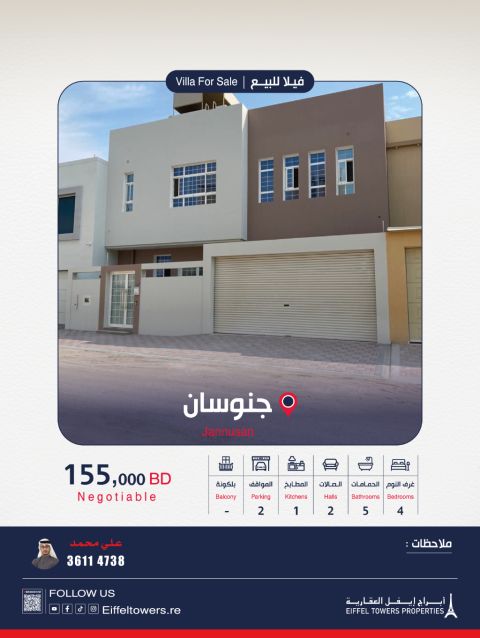 For sale: A luxurious sea-view villa with modern finishing inside Durrat Al Bahrain, built on an 800 m² plot overlooking the water channel. The villa includes 4 master bedrooms, spacious living rooms, two kitchens, a driver's room, a maid's room, and excellent outdoor areas featuring a swimming pool, garden, and seating area overlooking the water. The private jetty provides boat mooring possibilities, making it an ideal opportunity for upscale living or investment. Features: 4 master bedrooms, private jetty, swimming pool, outdoor majlis, internal kitchen. Contact.